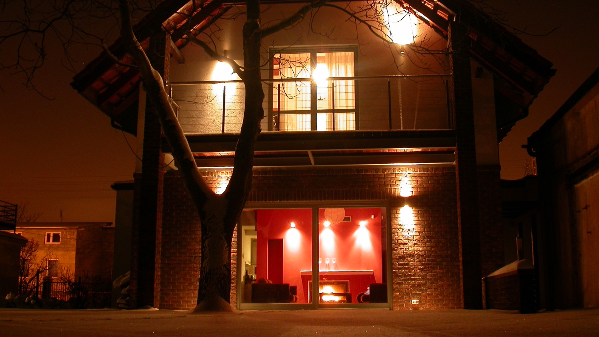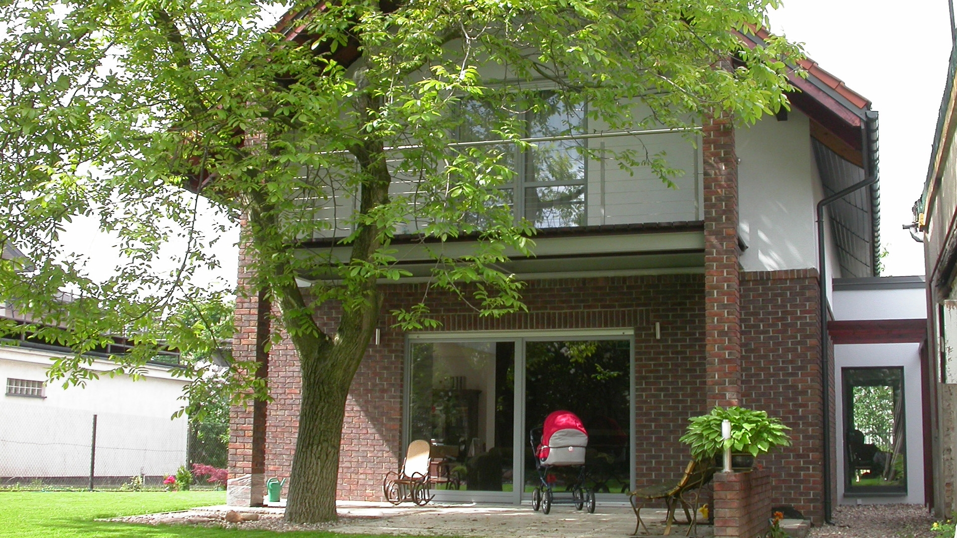 Dom usytuowany na wąskiej działce szerokość 20 m. Powstawał w okresie obowiązywania planu miejscowego ( materiały naturalne kąt dachu od 35o-45o). Z tyłu widoczny stary dom który po przebudowie zostanie zaadaptowany na garaż. Powierzchnia domu użytkowa 170 m2 –powierzchnia całkowita 180 m2.