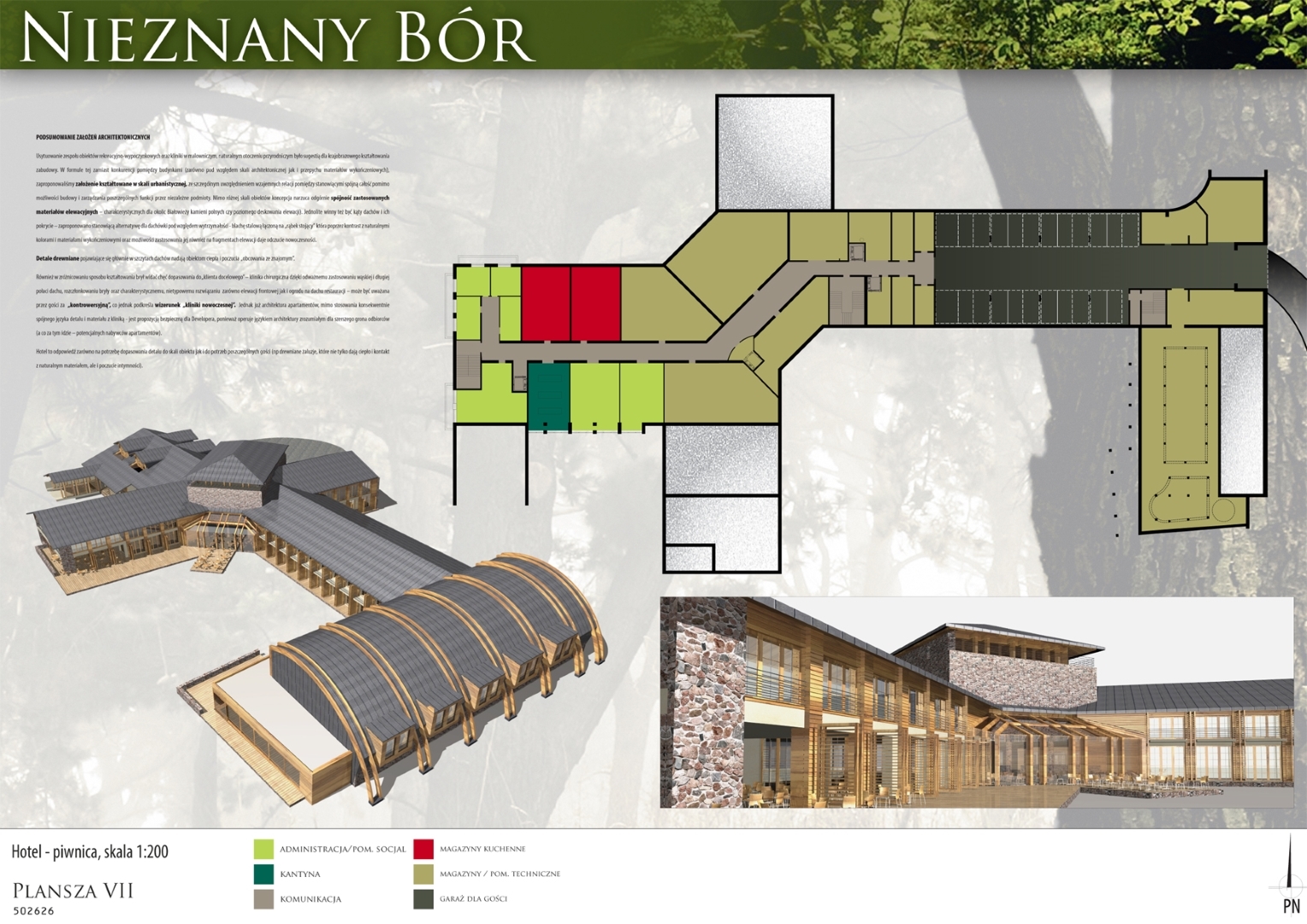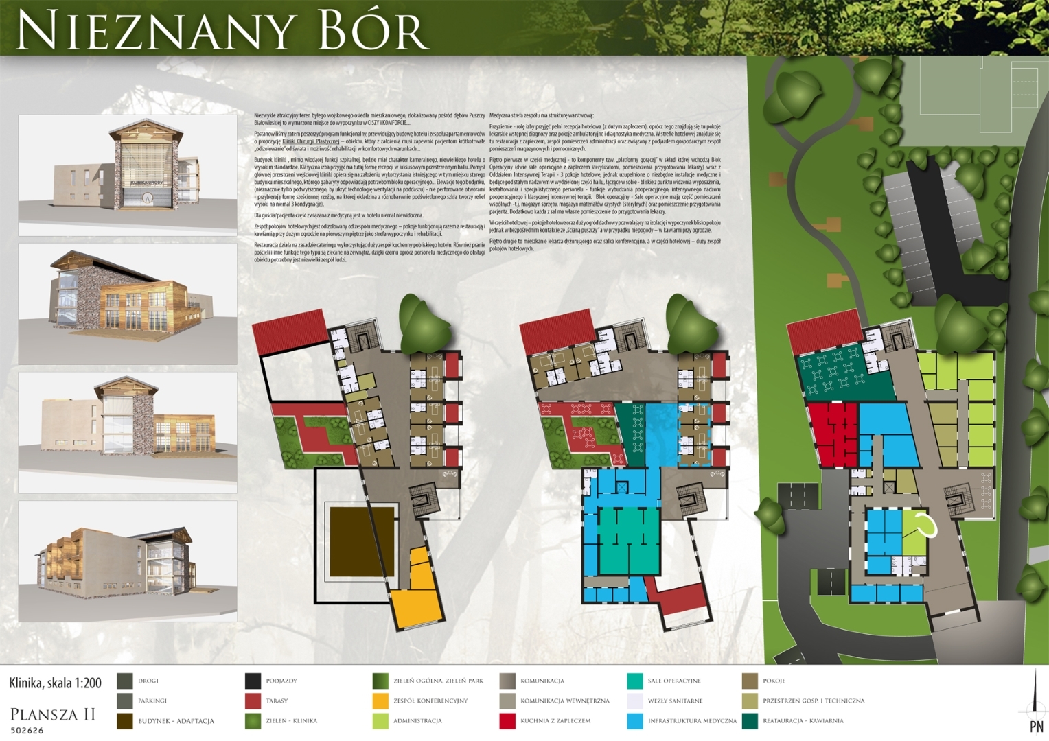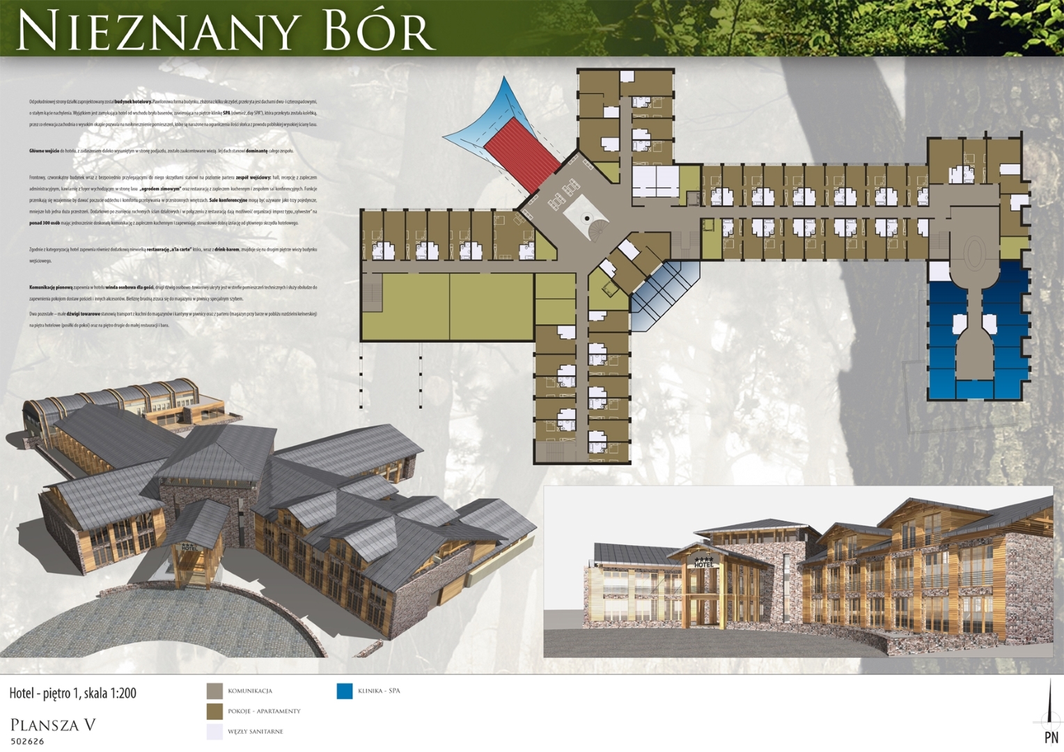 Projekt przygotowany na konkurs architektoniczny przez pracownie architektoniczną: PA&B i 3D PROJEKT. Program konkursu obejmował hotel **** z częścią SPA, klinikę chirurgi plastycznej, oraz zespół niedużych apartamentowców. Obiekty zostały zlokalizowany w przepięknym fragmencie Borów Tucholskich na obszarze dawnej bazy wojskowej (stąd prawdopodobnie nazwa „Nieznany Bór”.