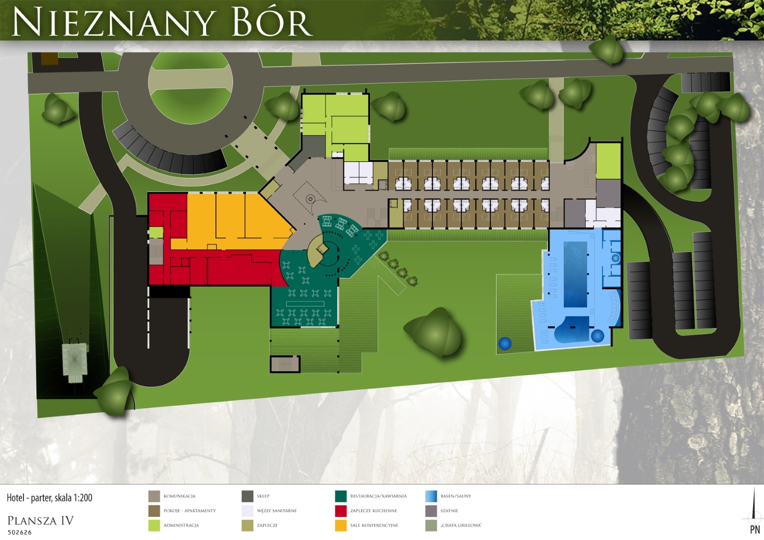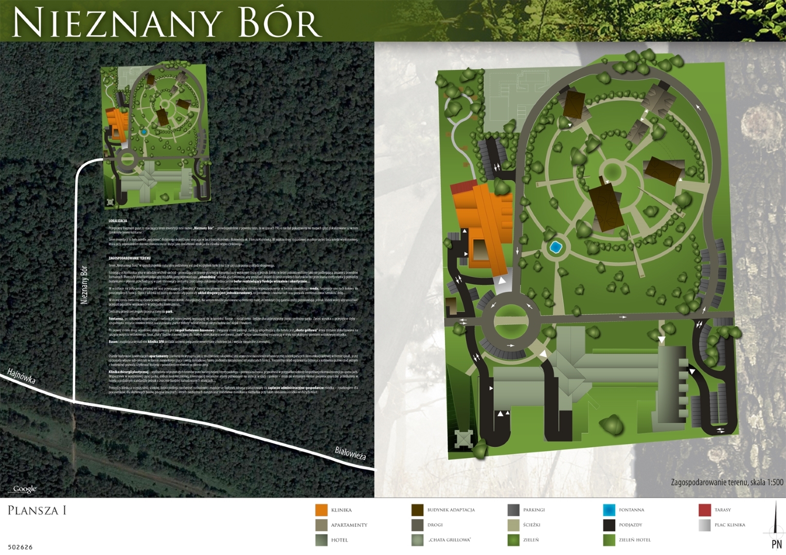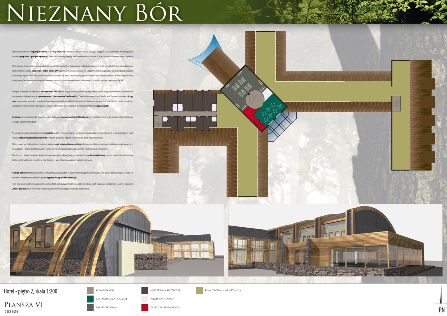 Projekt przygotowany na konkurs architektoniczny przez pracownie architektoniczną: PA&B i 3D PROJEKT. Program konkursu obejmował hotel **** z częścią SPA, klinikę chirurgi plastycznej, oraz zespół niedużych apartamentowców. Obiekty zostały zlokalizowany w przepięknym fragmencie Borów Tucholskich na obszarze dawnej bazy wojskowej (stąd prawdopodobnie nazwa „Nieznany Bór”.